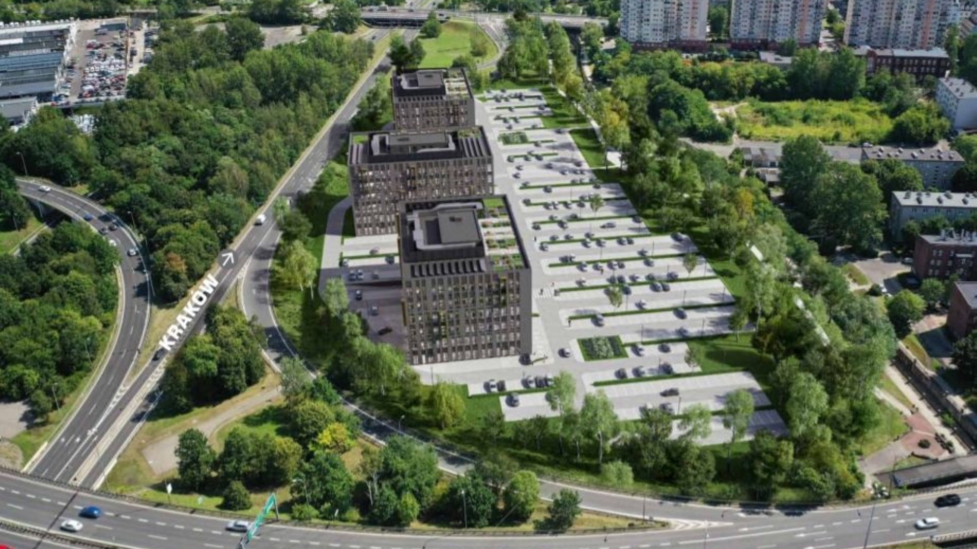 Biurowce 6 - kondygnacyjne z jedną kondygnacją garaży podziemnych. Koncepcja przewiduje 51 miejsc postojowych na poziomie -1. Przed biurowcami planowany jest parking naziemny na 696 miejsc postojowych dla samochodów osobowych.