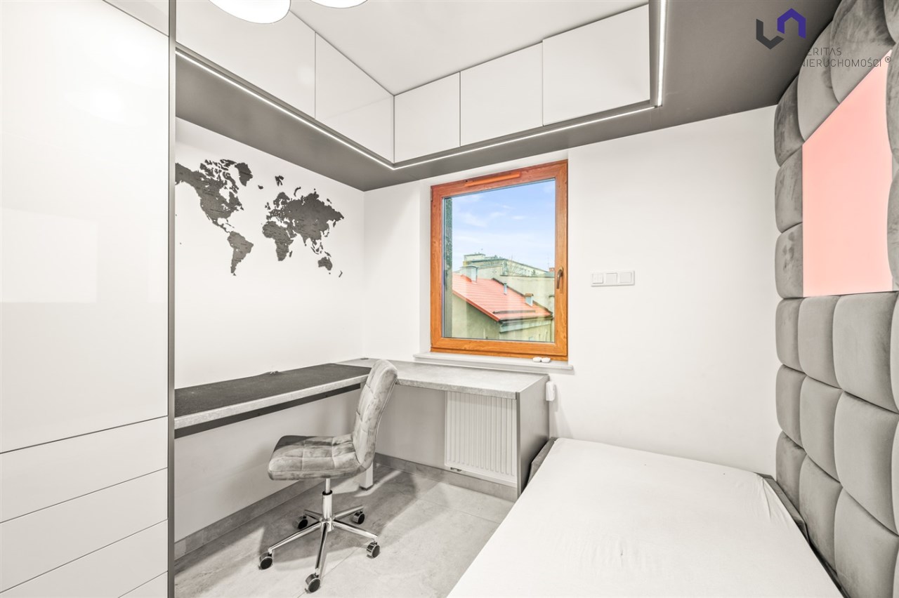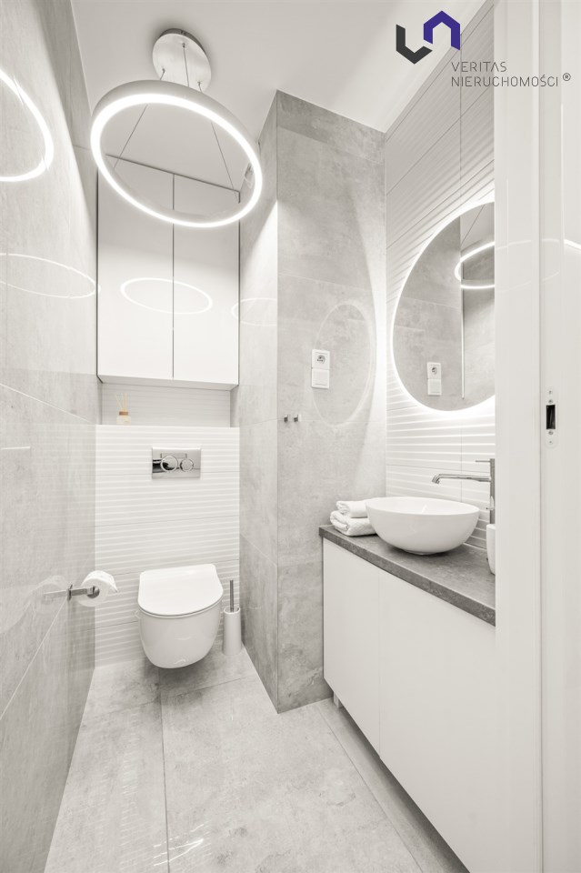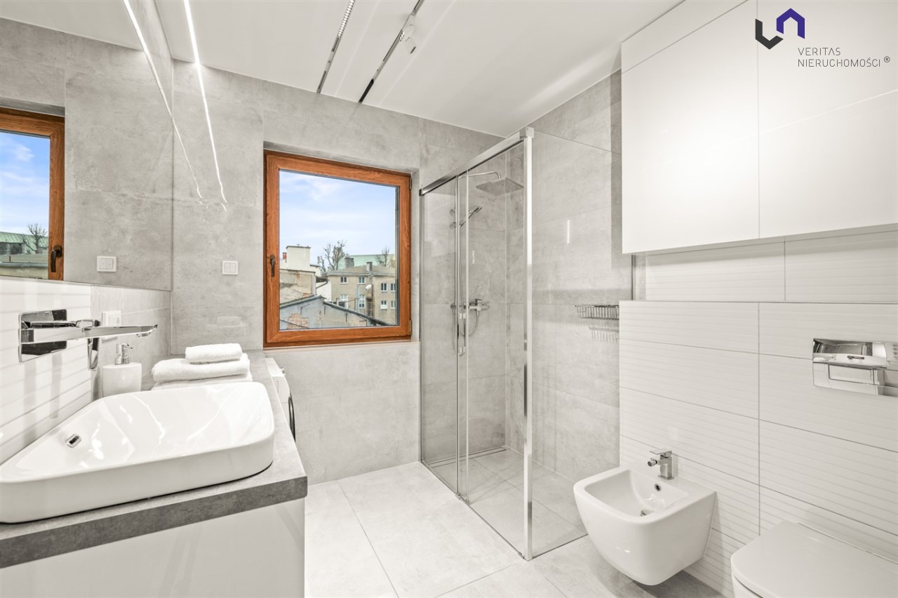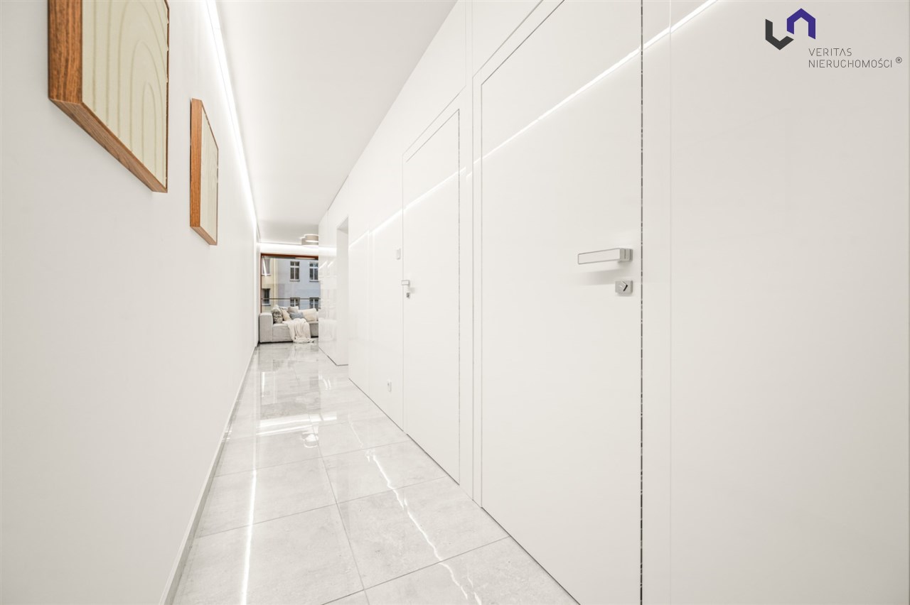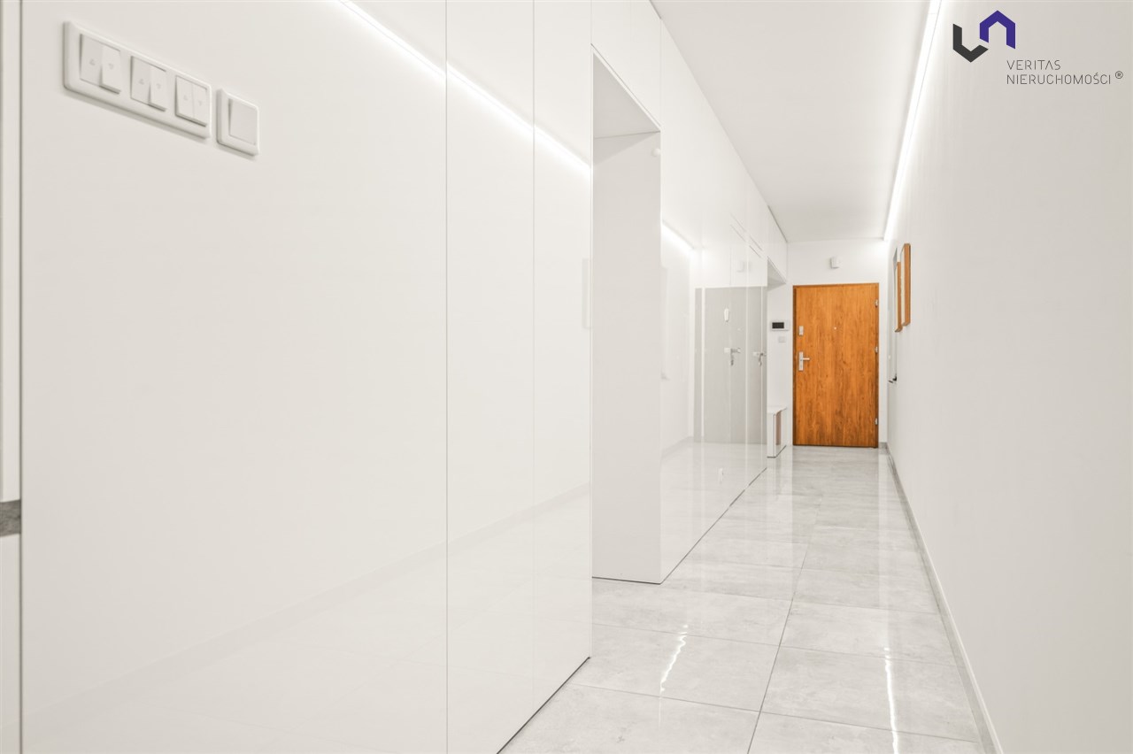 Apartament ma 80m2 składa się z 3 pokoi (duży salon 85-calowym TV i otwartą kuchnią, sypialnia, dodatkowy pokój - pełniący funkcję sypialni lub biura) łazienki z ogrzewaniem podłogowym, dodatkowej toalety i funkcjonalnie zaaranżowanego przedpokoju. Dodatkowo mieszkanie posiada zachodni balkon i południowy taras z miejscem do wypoczynku.